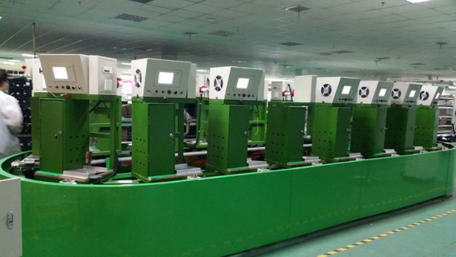 此環形檢測線是我公司為蕪湖格力電子分廠變頻外機DCT測試特別研制的。線體采用地軌鏈驅動,滑觸線供電,結構緊湊,共18個工位,長寬只有 7100mm*2400mm;操作方便,分別在一個上件點和一個下件點提供人力即可完成作業,將原來的分散間斷作業改為連續作業,以系統自動運行保障生產 節拍和產量的完成,提高了勞動生產效率。