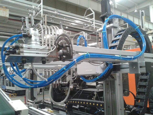 2014年10月,我們成功為格力電器公司研發出一款可以自動抓取風葉進行動平衡檢測的機械手。空調外機的風葉經注塑機注塑成型后由機械臂取出并放置到皮帶線上送走。機械手和注塑機配合,定期接取風葉放置到動平衡機上進行抽檢,合格后自動抓取放回皮帶線,不合格則報警提示。